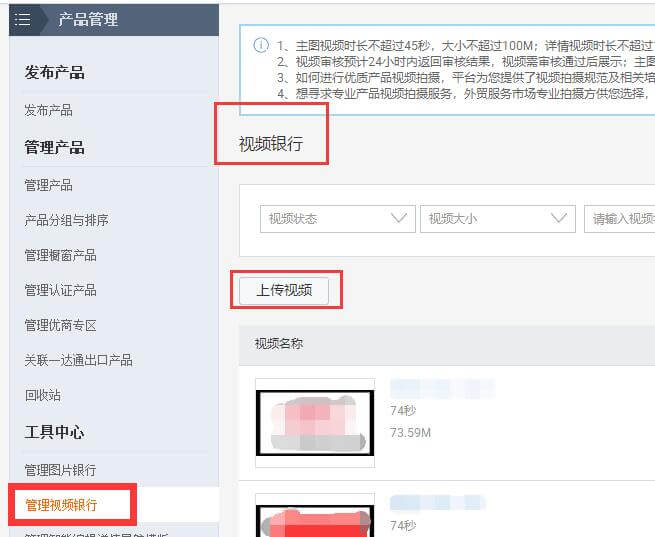 视频素材:准备好视频并上传到后台视频银行,一个视频只能关联20个产品,同一个视频可多次上传。