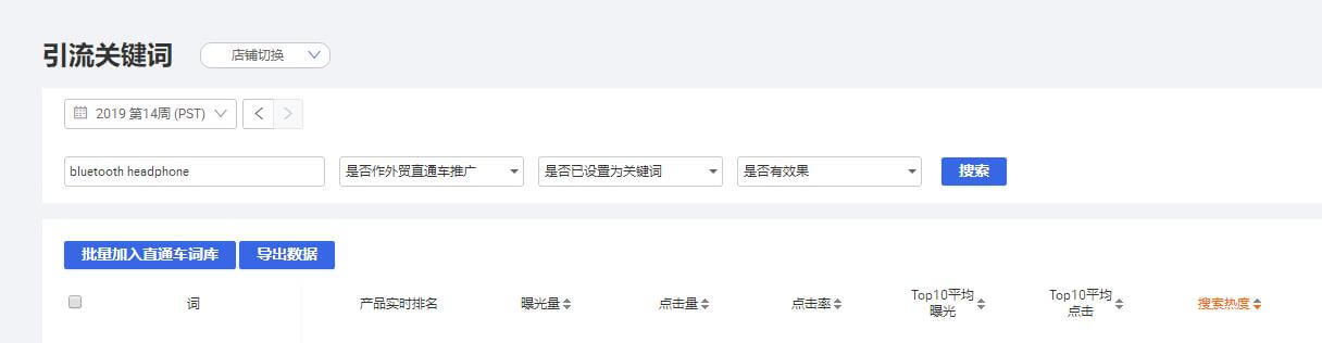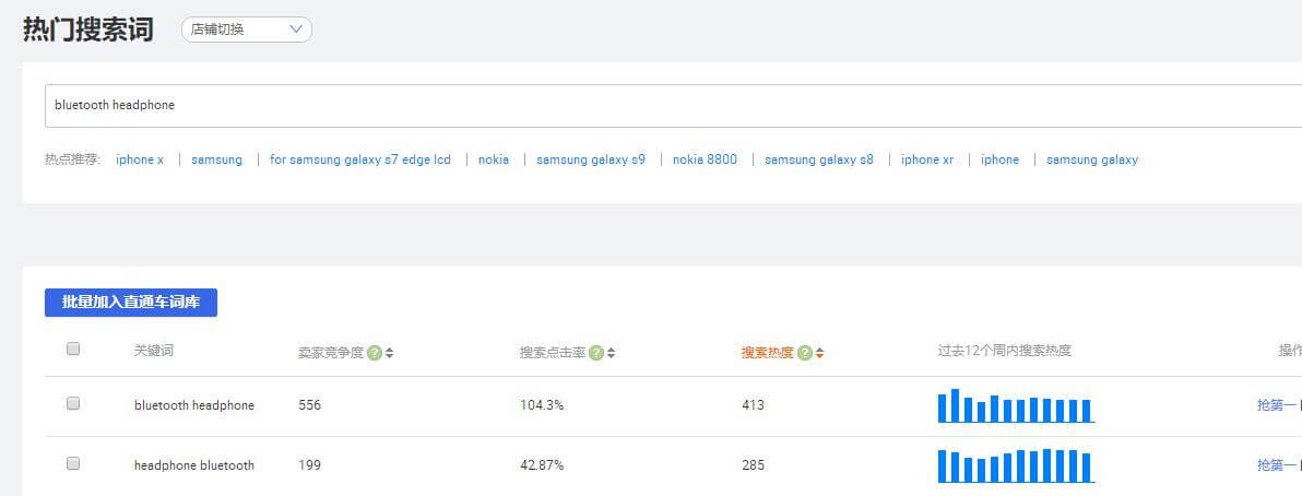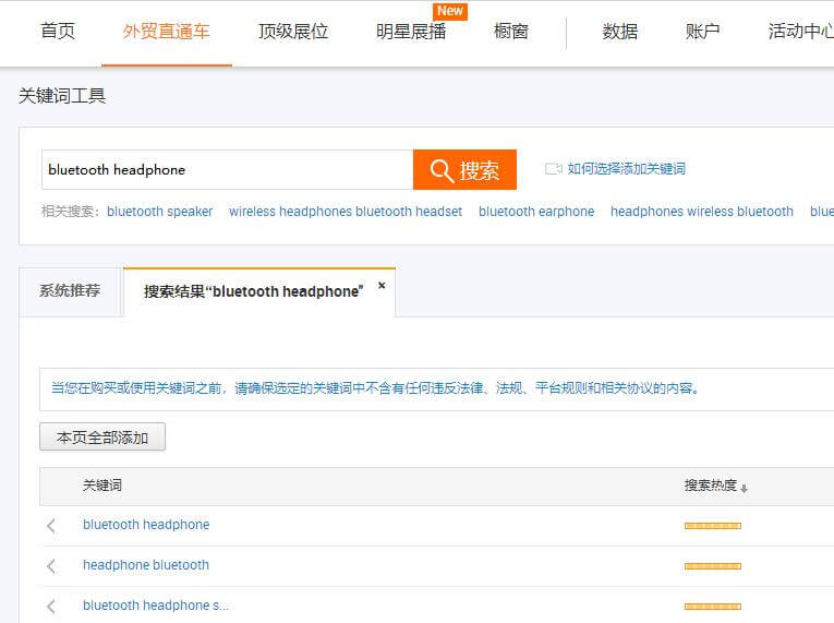 进入后台数据管家-热门搜索词,查找bluetooth headphone,把所有关键词拷贝到Excel表格中。有软件就用软件下载,没软件就手动。或者用插件提取:阿里巴巴国际站运营工具利用xpath插件提取关键词或标题 或 Firefox火狐浏览器插件TableTools2