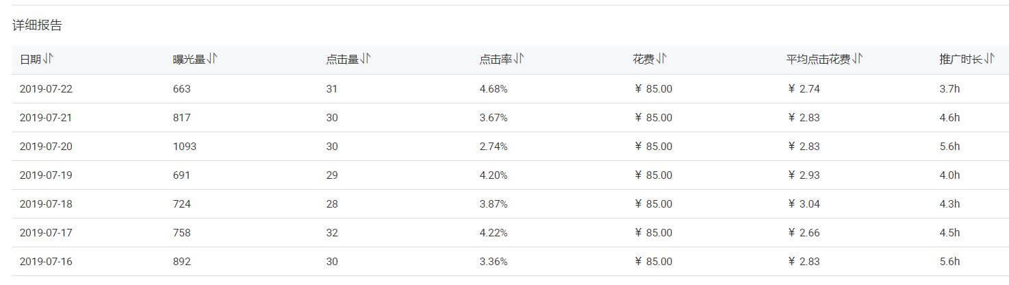 每天花费85元,每天平均点击30个,曝光平均800左右,点击率在3%左右,推广时长4小时,平均花费2.8左右。