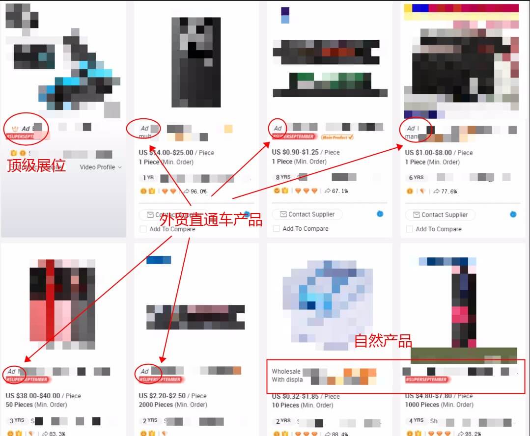 在www.alibaba.com 的products搜索栏搜索关键词,搜索结果中有以下几种情况的为广告产品,除此以外为自然排名: