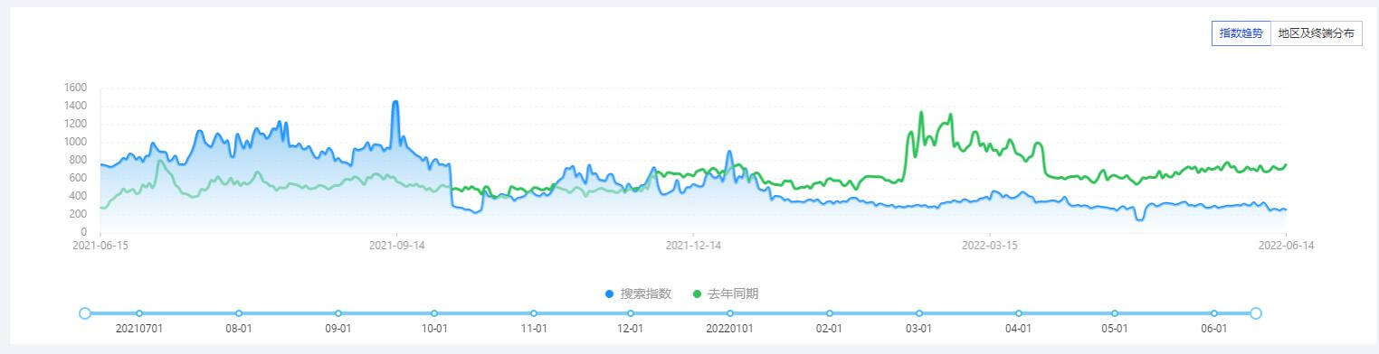 以产品最大热门关键词,查指数,从2021年10月份开始下滑,蓝色同比去年绿色曲线下滑很大,关键词搜索指数下降,客户搜索需求下跌,严重影响店铺效果。