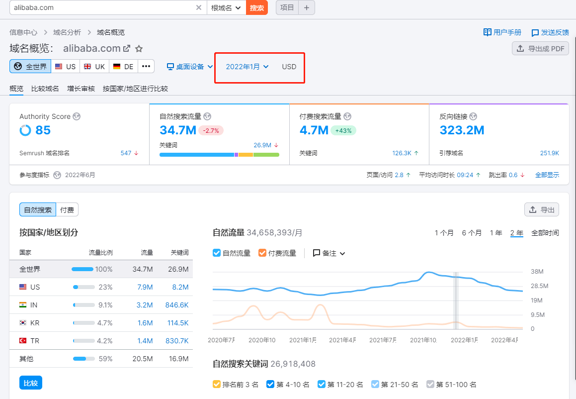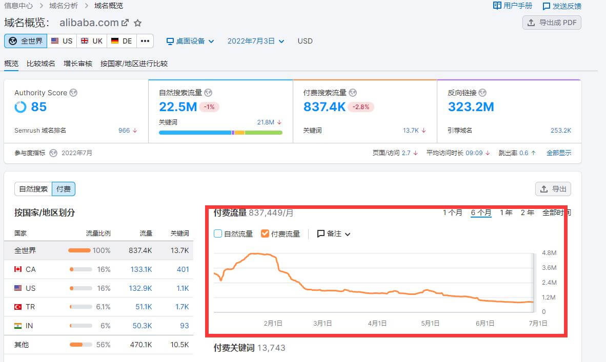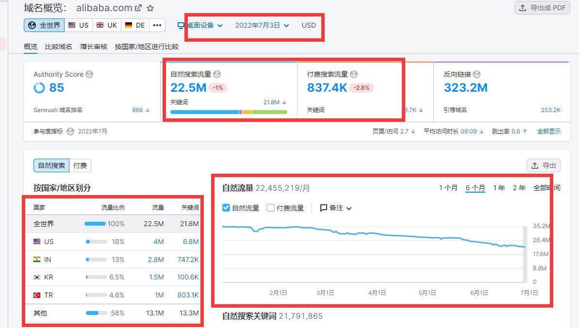 2022年7月的数据与1月对比,下降很多。近六个月不管是国家,还是自然与付费流量,都下降,自然流量的曲线也很明显。