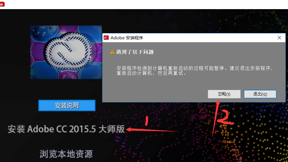 4.点击安装adobe cc 2015 大师版,弹出的窗口,直接忽略就可以了。