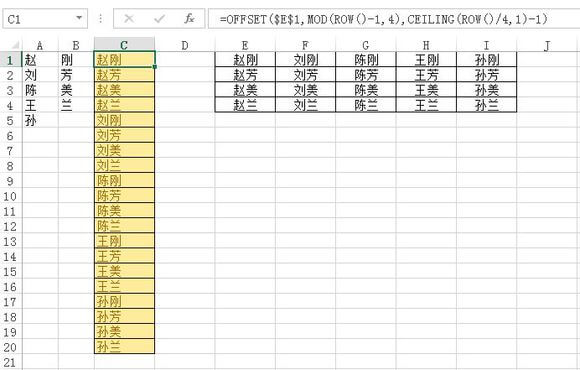=OFFSET($E$1,MOD(ROW()-1,4),CEILING(ROW()/4,1)-1)