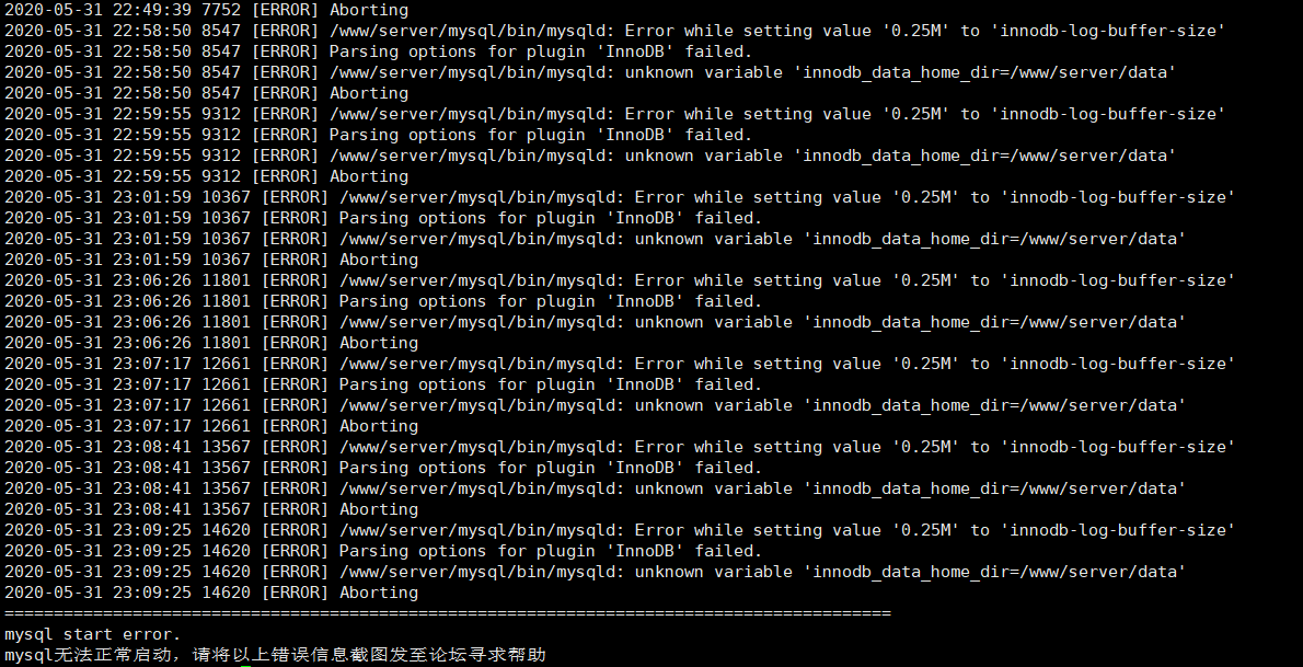 /www/server/mysql/bin/mysqld: Error while setting value '0.25M' to 'innodb-log-buffer-size' Parsing options for plugin 'InnoDB' failed. /www/server/mysql/bin/mysqld: unknown variable 'innodb_data_home_dir=/www/server/data' Aborting