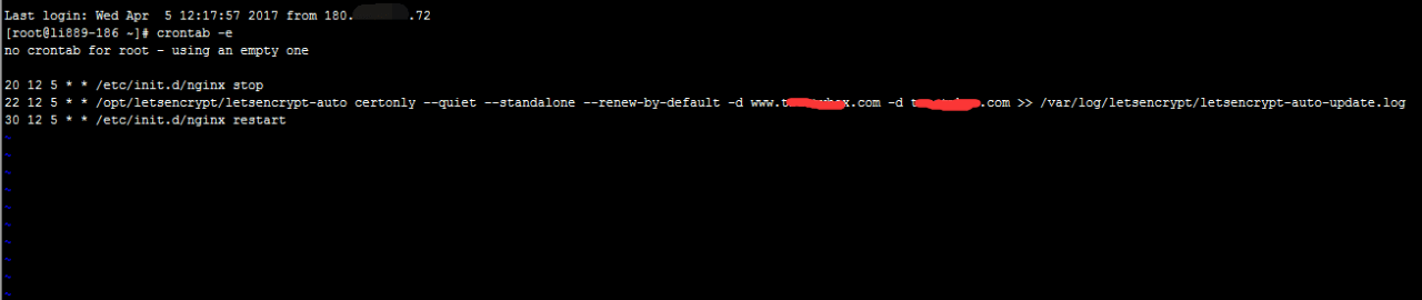 10 1 1 * * /etc/init.d/nginx stop 11 1 1 * * /opt/letsencrypt/letsencrypt-auto certonly --quiet --standalone --renew-by-default -d www.example.com -d example.com >> /var/log/letsencrypt/letsencrypt-auto-update.log 18 1 1 * * /etc/init.d/nginx restart