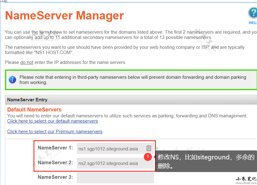 4、此时把原先的 Namesilo 的 NS1 和 NS2 地址改成 siteground 的 NS 地址,多余的NS记录删除,记得点击保存。修改NS效果如下图: