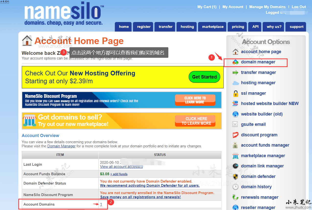1、登入Namesilo 之后,会自动转到管理页面,点击Account domains后面的1 或者 点击侧边菜单domain manager,进入域名管理。