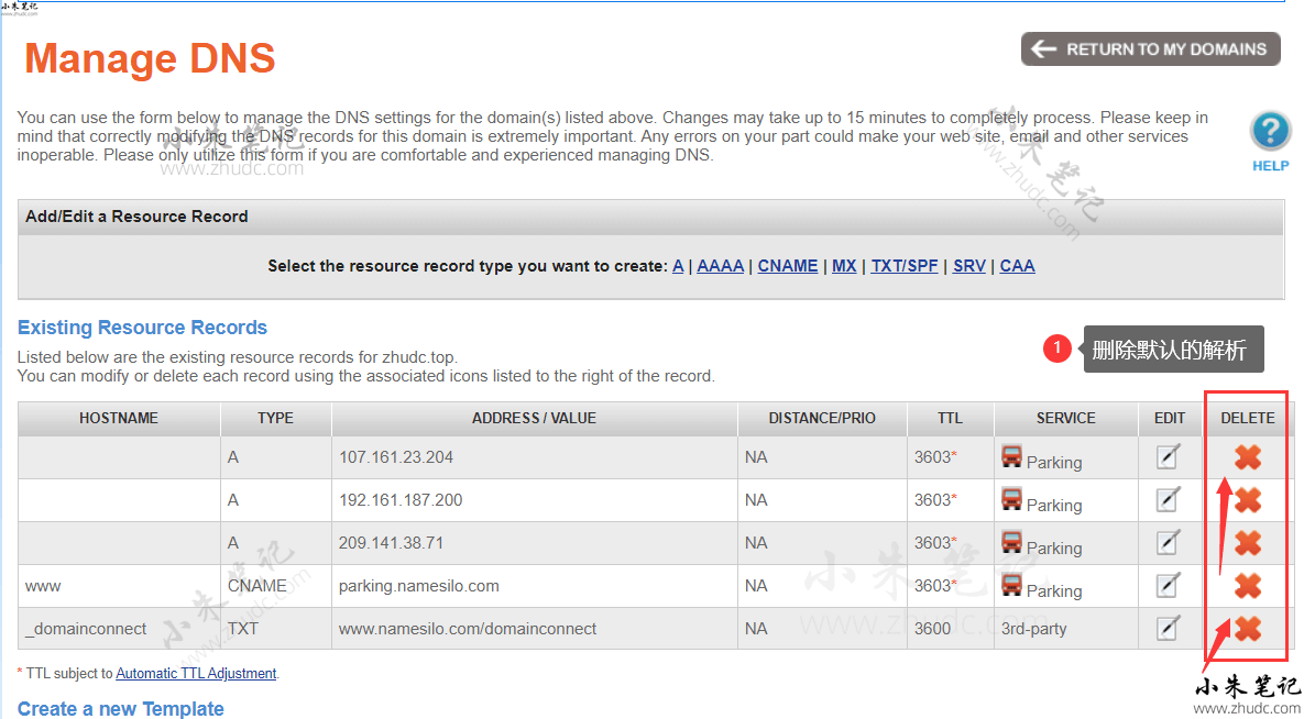 进入 DNS 解析页面后,Namesilo默认有几条解析记录,先把这几条已存在的 解析记录都删除,清空。(删除不掉,有提示,没关系,多点几次就能删除
