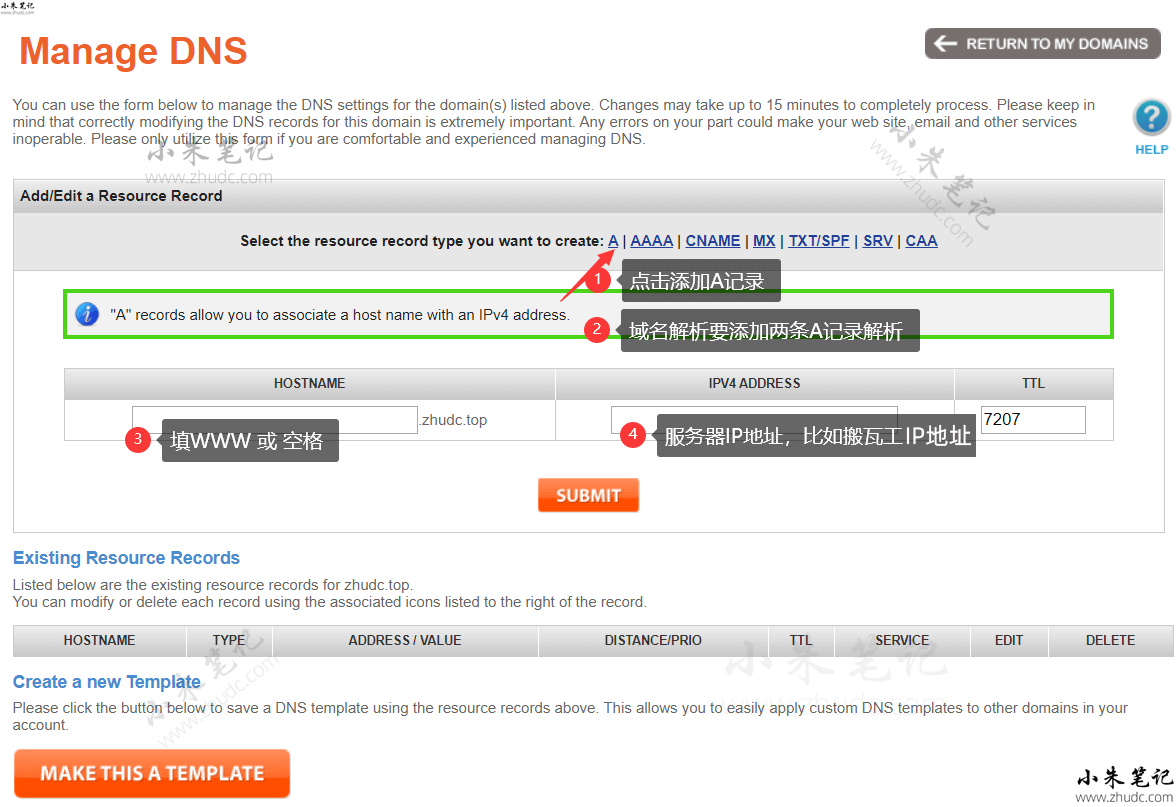 删除默认解析后,点击上方的 Add/Edit a Resource Record 里的 A,开始添加解析A记录。: