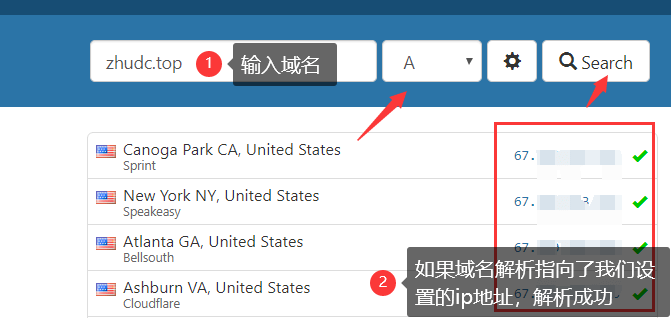 注:解析生效的时间大概在半个小时左右,我们可以通过ping IP的方式查看域名解析是否生效。或者使用dns网址查询:www.whatsmydns.net,如果域名A记录指向了我们设置的ip地址,解析成功。