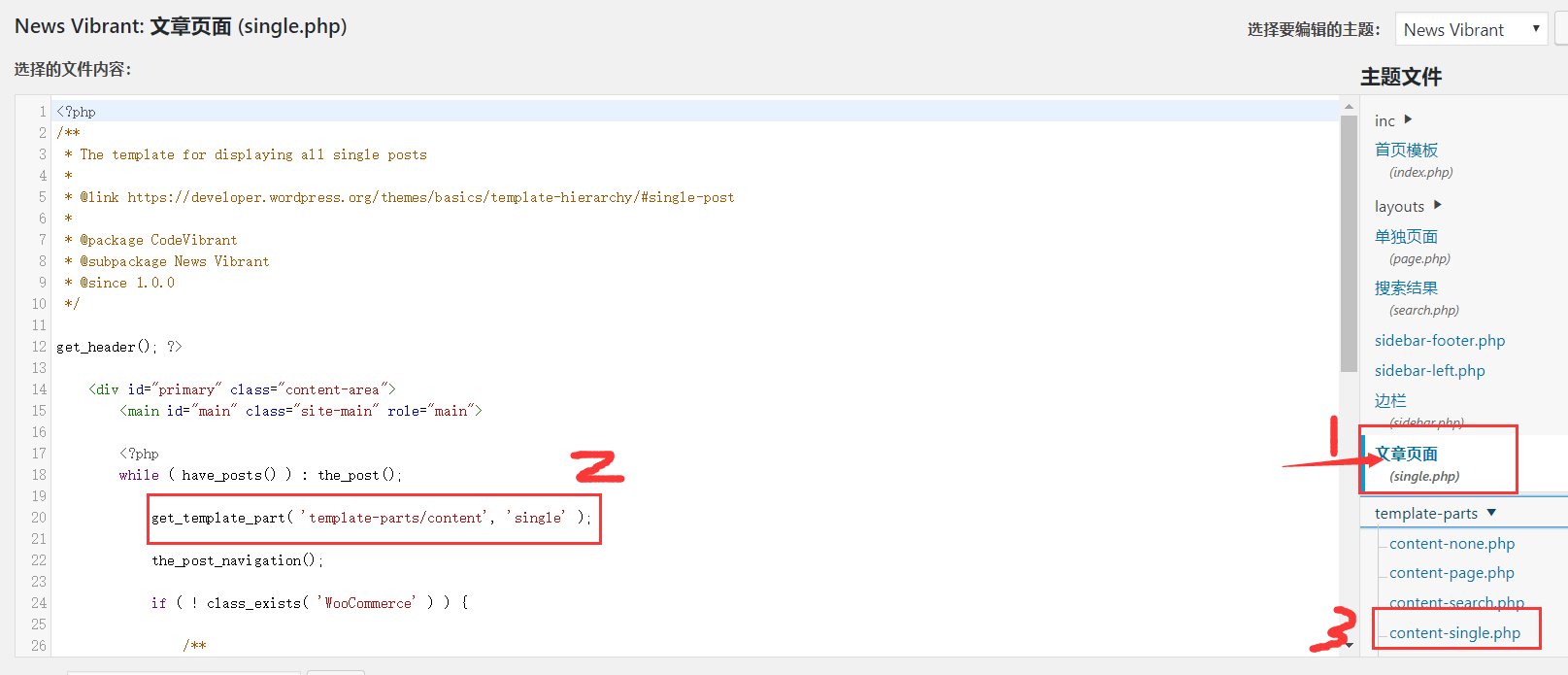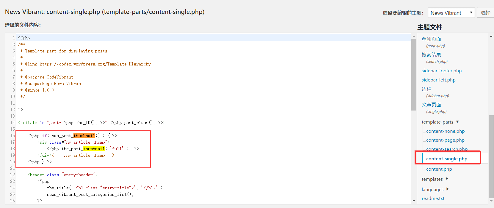 图一:找到single.php文件,利用ctrl+f 查找 thumbnail ,搜索不到,因为主题调用了其它文件 get_template_part( ‘template-parts/content’, ‘single’ );