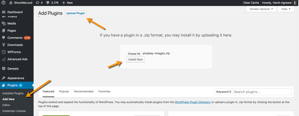如果您从某个地方下载了WordPress插件,则可以上传.zip文件并直接从WordPress仪表板安装。
