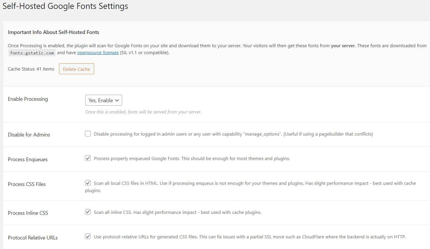 WordPress主题和插件都会使用到谷歌字体,国内影响加载速度。使用 Self-Hosted Google Fonts 插件来实现在自主服务器上使用网站的Google字体。Self-Hosted Google Fonts 将扫描您网站上的所有CSS,并自动下载必要的Google Web字体到自己的服务器,并修正好所有引用。启用插件的功能开关,一切都自动完成。