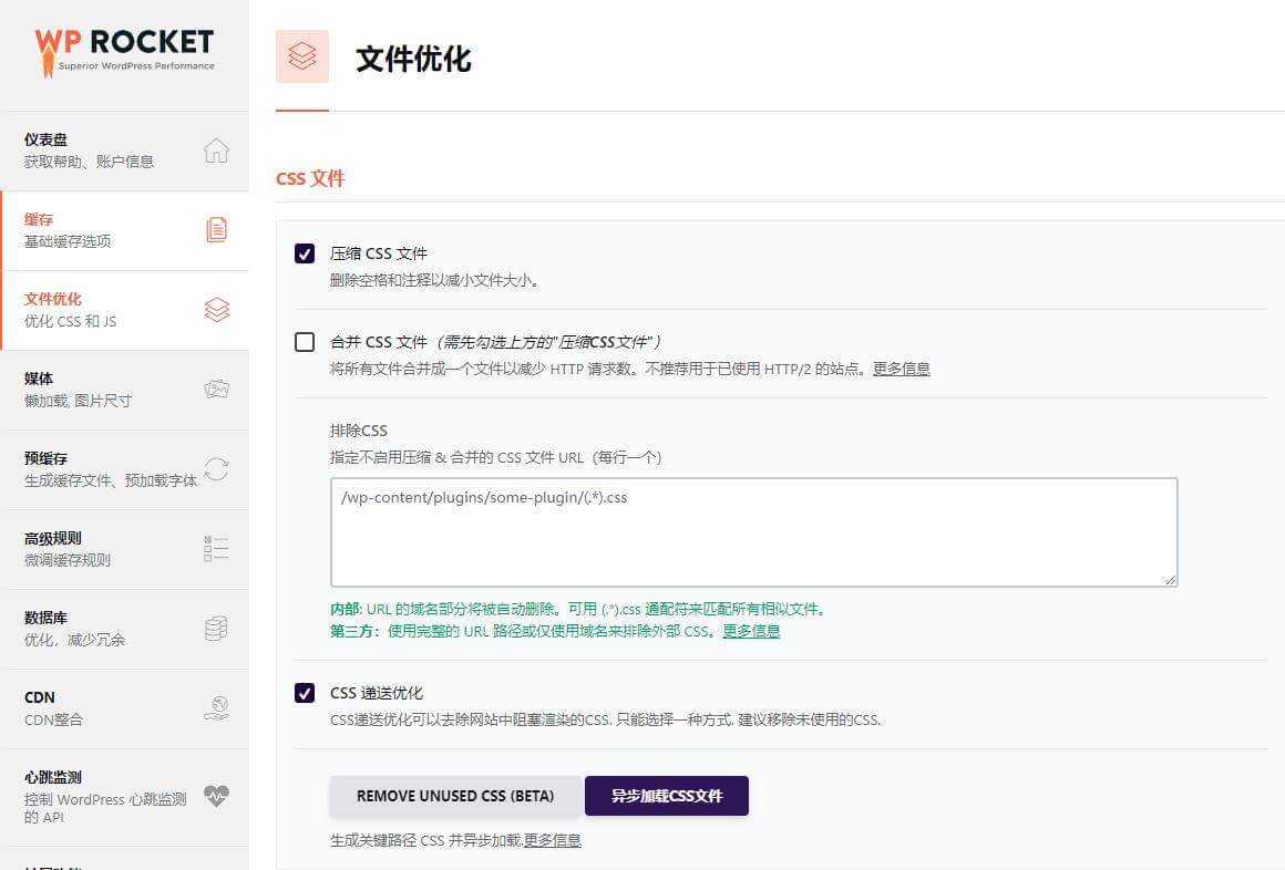 CSS:压缩文件与优化异步加载就可以了。没必要合并CSS文件,现在的网站基本上都是HTTP/2(什么是HTTP/2,百度学习),并且WP Rocket官方也不建议勾选(具体上官方看)。