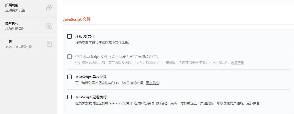 JS文件:有些人都会全部勾选,有些主题也有自带的。与主题有些冲突,有些兼容,在WP Rocket可以不勾选。