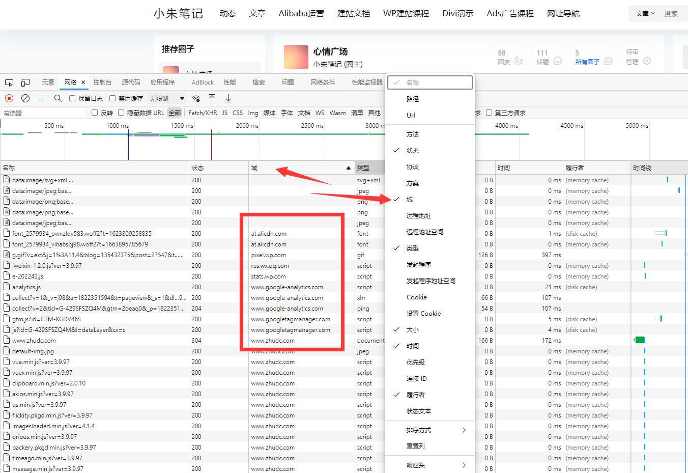 任何浏览器,打开网站,右击检查,弹出检查窗口,选择网络,刷新网站,显示网站加载内容,包括图片,字体,JS等。右击把域名调出来,第三方资源就显示了,把这些第三方域名链接,粘贴到WP Rocket的DNS预读取窗口。