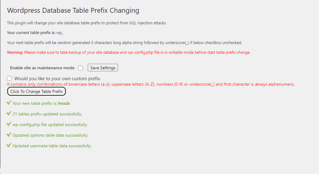 打开插件后,勾选“Would you like to your own custom prefix”,然后下方的文本框输入我们新的表前缀,比如”wpes_”(一定要注意格式)